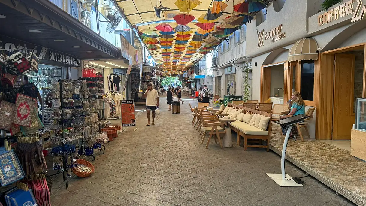 Muğla'nın Fethiye ilçesinde kavurucu sıcakların etkisini artırmasıyla birlikte Çarşı genelinde insanların dışarı çıkmaması nedeniyle sakinlik hakim.