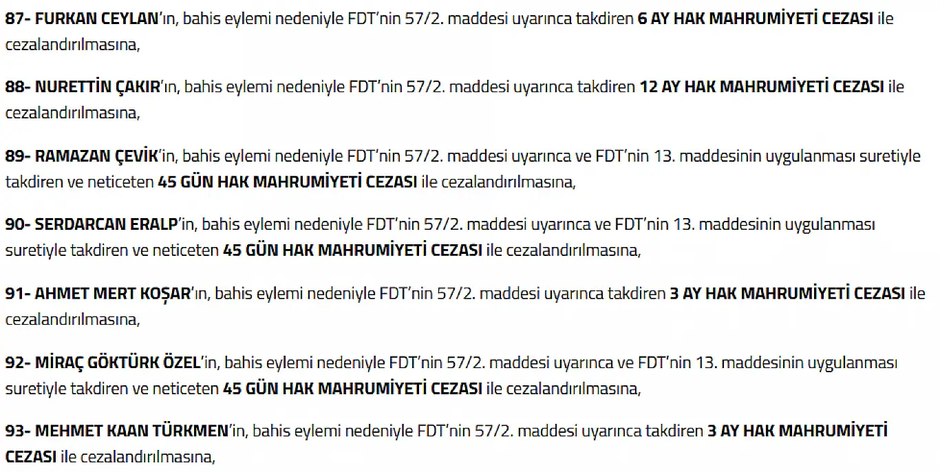 PFDK’nın futbolcularla ilgili verdiği cezalar şöyle: