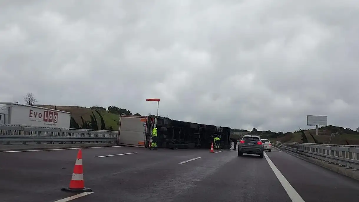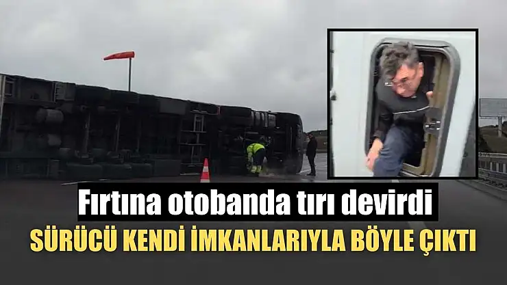 Fırtına otobanda tırı devirdi, sürücü kendi imkanlarıyla böyle çıktı