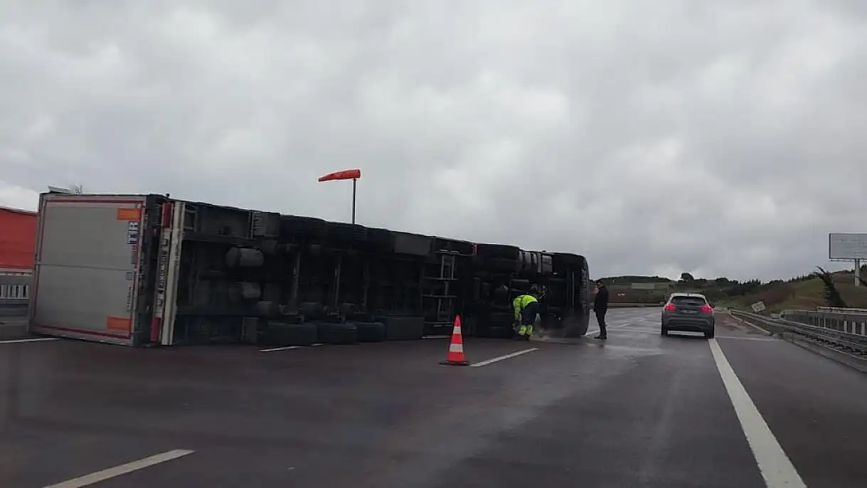 Fırtına otobanda tırı devirdi, sürücü kendi imkanlarıyla böyle çıktı