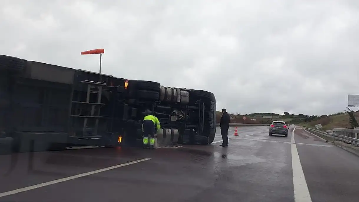 Fırtına otobanda tırı devirdi, sürücü kendi imkanlarıyla böyle çıktı