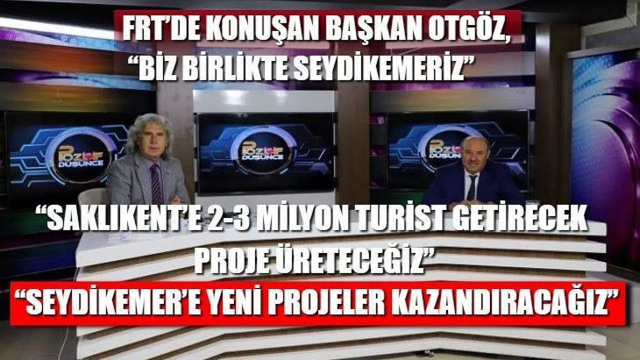‘Seydikemer ilçesinin imar planlarını bitirdikten sonra Millet Bahçesi, Yaşam alanları, turizm alanları ve ilçemizin hakkettiği tüm yatırımları almak için tüm ekibimle gece gündüz demeden çalışmalara devam edeceğiz’ diyen başkan Otgöz, “Bizlere ilçemizi anlatma fırsatı verdiğiniz için size ve şahsınızda FRT ailesine teşekkür ederim. Seydikemer’in yatırımları hız kesmeden devam edecek olup Bu hizmetlerin yapılmasın da Başta Cumhurbaşkanımız Sayın Recep Tayyip Erdoğan’a, Milletvekillerimiz Sayın Mehmet Yavuz Demir ve Sayın Yelda Erol Gökcan, İl Başkanımız Sayın Kadem Mete’ye Valimiz Sayın Orhan Tavlıya ve Seydikemer Kaymakamımız Sayın Ahmet Güneri’ye İlçe Başkanımız Sayın Salih Gümüşe ve emeği geçen herkese teşekkür ediyorum. Biz Birlikte Seydikemeriz” diye sözlerini tamamladı.