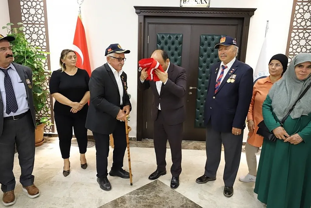 Sohbet havasında geçen ziyarette Fethiye Muharip Gaziler ve Şehit Aileleri Yardımlaşma ve Dayanışma Derneği Başkanı Namık Ünal, Cumhuriyetimizin 100. yılı dolayısıyla Seydikemer Belediye Başkanı B. Önder Akdenizli’ye bayrak hediye ettiler.