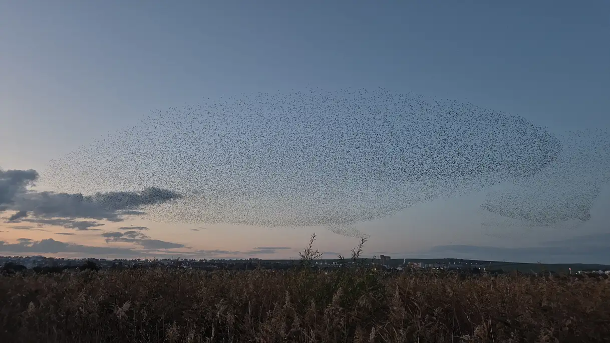 Tekirdağ'ın Süleymanpaşa ilçesinde gün batımına doğru toplanan sığırcık sürüleri, havada oluşan yoğun kümeler halinde dalgalanarak adeta bir dans sergiledi.