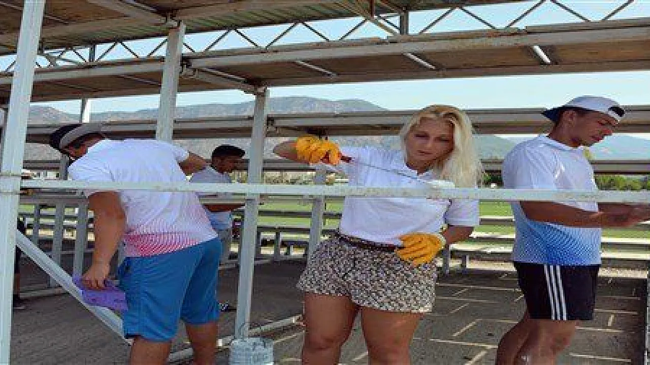 Muğla'da düzenlenen Uluslararası Gönüllü Çalışma Kampı'na Türkiye, Almanya ve Rusya'dan katılan 27 öğrenci, Köyceğiz Mehmet Özkaya Stadı'nda çevre düzenlemesi yaparak tribünleri boyadı.