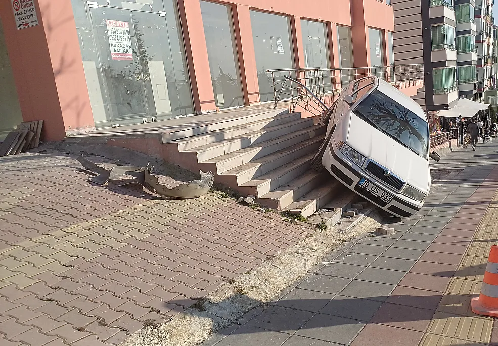Görenler şoke oldu! Otomobil merdivenin üzerinde asılı kaldı