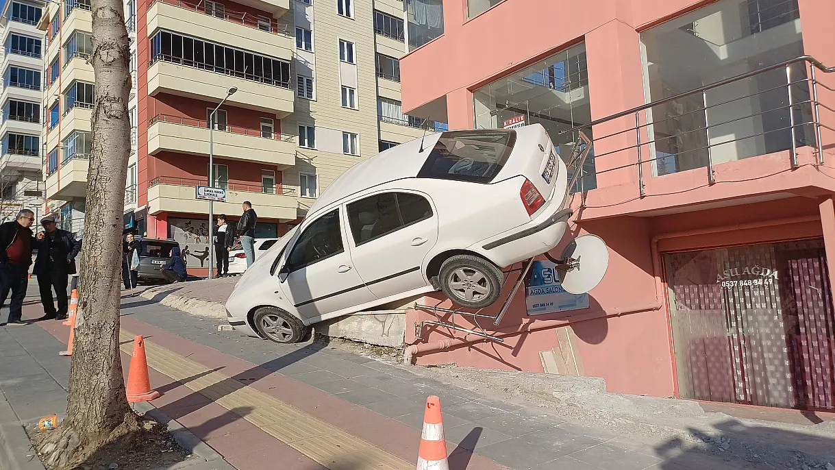 Görenler şoke oldu! Otomobil merdivenin üzerinde asılı kaldı