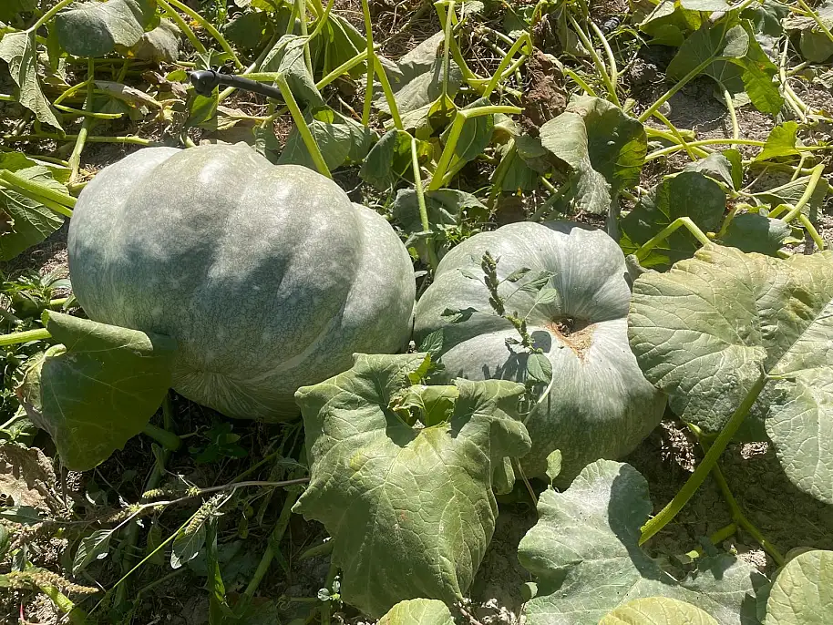 Bal kabaklarını iki haftadır görmeyen Çavdar, yaprakları kaldırdığında 40 kilograma ulaşan 2 kabak görünce mutlu oldu.