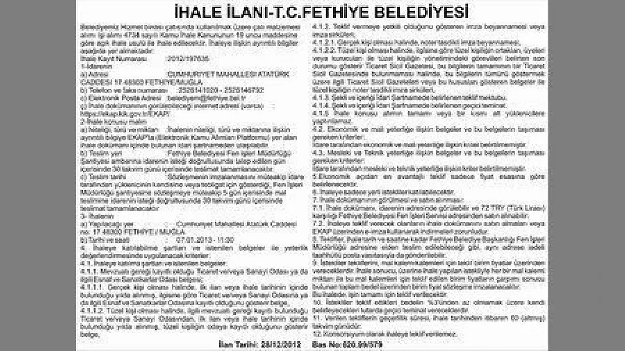 Belediyemiz Hizmet binası çatısında kullanılmak üzere çatı malzemesi alımı işi alımı 4734 sayılı Kamu İhale Kanununun 19 uncu maddesine göre açık ihale usulü ile ihale edilecektir. İhaleye ilişkin ayrıntılı bilgiler aşağıda yer almaktadır: İhale Kayıt Numarası : 2012/197635 1-İdarenin a) Adresi : CUMHURIYET MAHALLESI ATATÜRK CADDESI 17 48300 FETHİYE/MUĞLA b) Telefon ve faks numarası : 2526141020 - 2526146792 c) Elektronik Posta Adresi : [email protected] ç) İhale dokümanının görülebileceği internet adresi (varsa) : https://ekap.kik.gov.tr/EKAP/ 2-İhale konusu malın a) Niteliği, türü ve miktarı : İhalenin niteliği, türü ve miktarına ilişkin ayrıntılı bilgiye EKAP’ta (Elektronik Kamu Alımları Platformu) yer alan ihale dokümanı içinde bulunan idari şartnameden ulaşılabilir. b) Teslim yeri : Fethiye Belediyesi Fen işleri Müdürlüğü Şantiyesi ambarına idarenin isteği doğrultusunda talep edilen gün içerisinde 30 takvim günü içerisinde teslimat tamamlanacaktır. c) Teslim tarihi : Sözleşmenin imzalanmasını müteakip idare tarafından yüklenicinin kendisine veya tebligat için gösterdiği, Fen İşleri Müdürlüğü şantiyesine sözleşmeye müteakip 5 gün içerisinde mal teslimine idarenin isteği doğrultusunda 30 takvim günü içerisinde teslimat tamamlanacaktır 3- İhalenin a) Yapılacağı yer : Cumhuriyet Mahallesi Atatürk Caddesi no: 17 48300 FETHİYE / MUĞLA b) Tarihi ve saati : 07.01.2013 - 11:30 4. İhaleye katılabilme şartları ve istenilen belgeler ile yeterlik değerlendirmesinde uygulanacak kriterler: 4.1. İhaleye katılma şartları ve istenilen belgeler: 4.1.1. Mevzuatı gereği kayıtlı olduğu Ticaret ve/veya Sanayi Odası ya da ilgili Esnaf ve Sanatkarlar Odası belgesi; 4.1.1.1. Gerçek kişi olması halinde, ilk ilan veya ihale tarihinin içinde bulunduğu yılda alınmış, ilgisine göre Ticaret ve/veya Sanayi Odasına ya da ilgili Esnaf ve Sanatkarlar Odasına kayıtlı olduğunu gösterir belge, 4.1.1.2. Tüzel kişi olması halinde, ilgili mevzuatı gereği kayıtlı bulunduğu Ticaret ve/veya Sanayi Odasından, ilk ilan veya ihale tarihinin içinde bulunduğu yılda alınmış, tüzel kişiliğin odaya kayıtlı olduğunu gösterir belge, 4.1.2. Teklif vermeye yetkili olduğunu gösteren imza beyannamesi veya imza sirküleri; 4.1.2.1. Gerçek kişi olması halinde, noter tasdikli imza beyannamesi, 4.1.2.2. Tüzel kişi olması halinde, ilgisine göre tüzel kişiliğin ortakları, üyeleri veya kurucuları ile tüzel kişiliğin yönetimindeki görevlileri belirten son durumu gösterir Ticaret Sicil Gazetesi, bu bilgilerin tamamının bir Ticaret Sicil Gazetesinde bulunmaması halinde, bu bilgilerin tümünü göstermek üzere ilgili Ticaret Sicil Gazeteleri veya bu hususları gösteren belgeler ile tüzel kişiliğin noter tasdikli imza sirküleri, 4.1.3. Şekli ve içeriği İdari Şartnamede belirlenen teklif mektubu. 4.1.4. Şekli ve içeriği İdari Şartnamede belirlenen geçici teminat. 4.1.5 İhale konusu alımın tamamı veya bir kısmı alt yüklenicilere yaptırılamaz. 4.2. Ekonomik ve mali yeterliğe ilişkin belgeler ve bu belgelerin taşıması gereken kriterler: İdare tarafından ekonomik ve mali yeterliğe ilişkin kriter belirtilmemiştir. 4.3. Mesleki ve Teknik yeterliğe ilişkin belgeler ve bu belgelerin taşıması gereken kriterler: İdare tarafından mesleki ve teknik yeterliğe ilişkin kriter belirtilmemiştir. 5.Ekonomik açıdan en avantajlı teklif sadece fiyat esasına göre belirlenecektir. 6. İhaleye sadece yerli istekliler katılabilecektir. 7. İhale dokümanının görülmesi ve satın alınması: 7.1. İhale dokümanı, idarenin adresinde görülebilir ve 72 TRY (Türk Lirası) karşılığı Fethiye Belediyesi Fen İşleri Servisi adresinden satın alınabilir. 7.2. İhaleye teklif verecek olanların ihale dokümanını satın almaları veya EKAP üzerinden e-imza kullanarak indirmeleri zorunludur. 8. Teklifler, ihale tarih ve saatine kadar Fethiye Belediye Başkanlığı Fen İşleri Müdürlüğü adresine elden teslim edilebileceği gibi, aynı adrese iadeli taahhütlü posta vasıtasıyla da gönderilebilir. 9. İstekliler tekliflerini, mal kalem-kalemleri için teklif birim fiyatlar üzerinden vereceklerdir. İhale sonucu, üzerine ihale yapılan istekliyle her bir mal kalemi miktarı ile bu mal kalemleri için teklif edilen birim fiyatların çarpımı sonucu bulunan toplam bedel üzerinden birim fiyat sözleşme imzalanacaktır. Bu ihalede, işin tamamı için teklif verilecektir. 10. İstekliler teklif ettikleri bedelin %3’ünden az olmamak üzere kendi belirleyecekleri tutarda geçici teminat vereceklerdir. 11. Verilen tekliflerin geçerlilik süresi, ihale tarihinden itibaren 60 (altmış) takvim günüdür. 12. Konsorsiyum olarak ihaleye teklif verilemez.