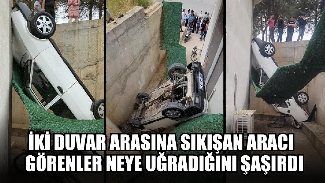 Sürücüsünün park ederken el frenini çekmeyi unuttuğu otomobil kayarak 5 metre yükseklikten düşüp iki duvar arasına sıkıştı.