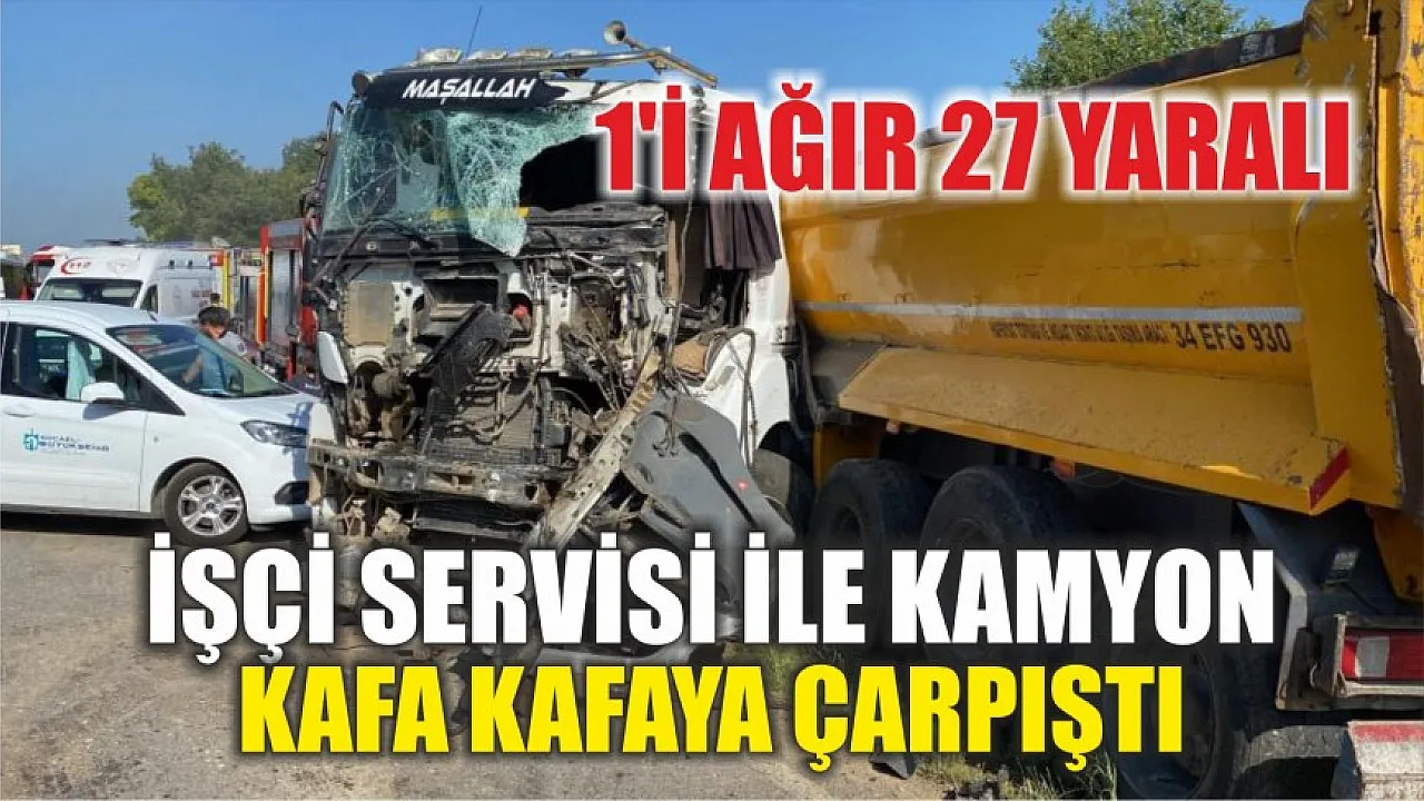 İşçi taşıyan servis otobüsünün damperli tır ile kafa kafaya çarpması neticesinde meydana gelen kazada 1'i ağır 27 kişi yaralandı.