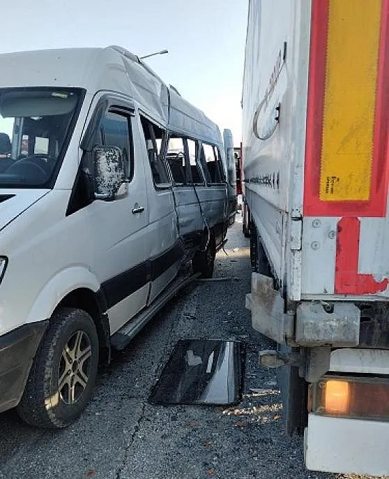 İşçi servisi ile tırın çarpıştığı kazada ilk belirlemere göre 12 kişi yaralandı.