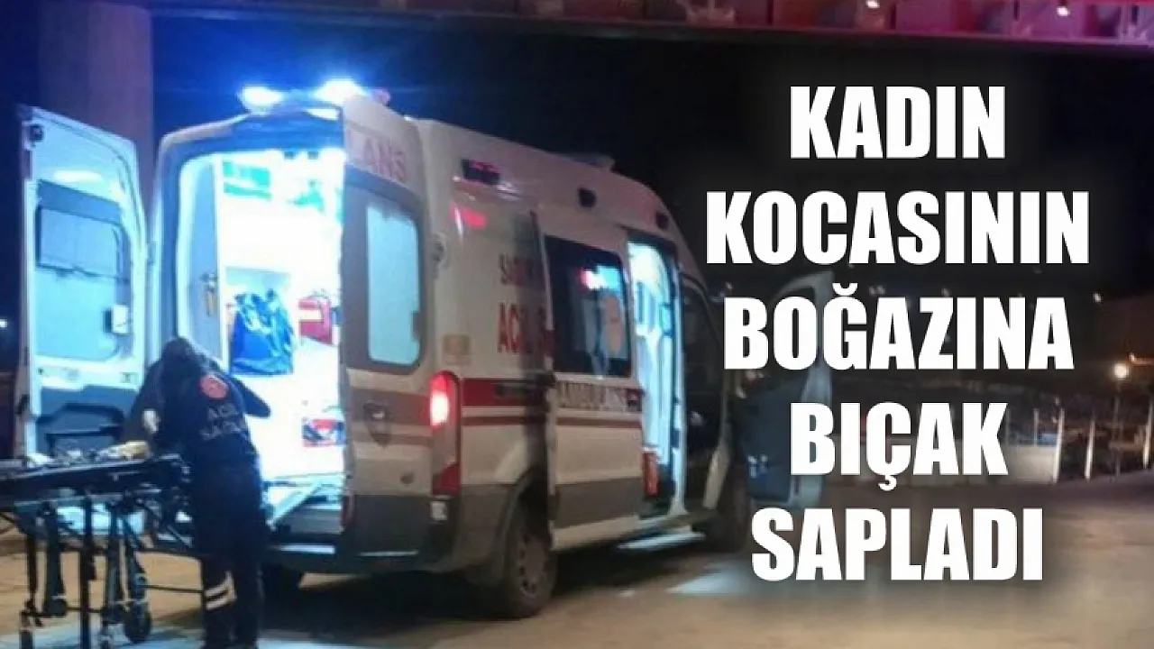 Tartıştığı kocasının boğazına bıçak saplayan kadın gözaltına alınırken, ağır yaralanan kocası ameliyata alındı.