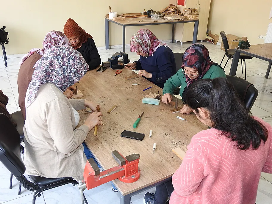 Sedef kakma kursuna katılan kadınlar, hünerli elleriyle birbirinden güzel ahşap işlemeler yapıyor.