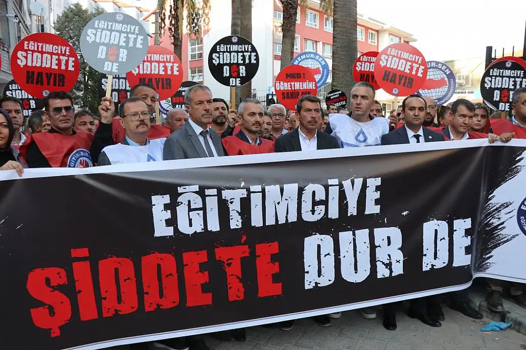 Denizli'de öğrencilerini taciz ettiği ve kendisine 'Kan akacak' diyerek tehdit etmesi üzerine kantin işletmecisinin oğlu hakkında şikayette bulunan okul müdürünün silahlı saldırıya uğraması hakkında eğitimciler eylem yaptı.