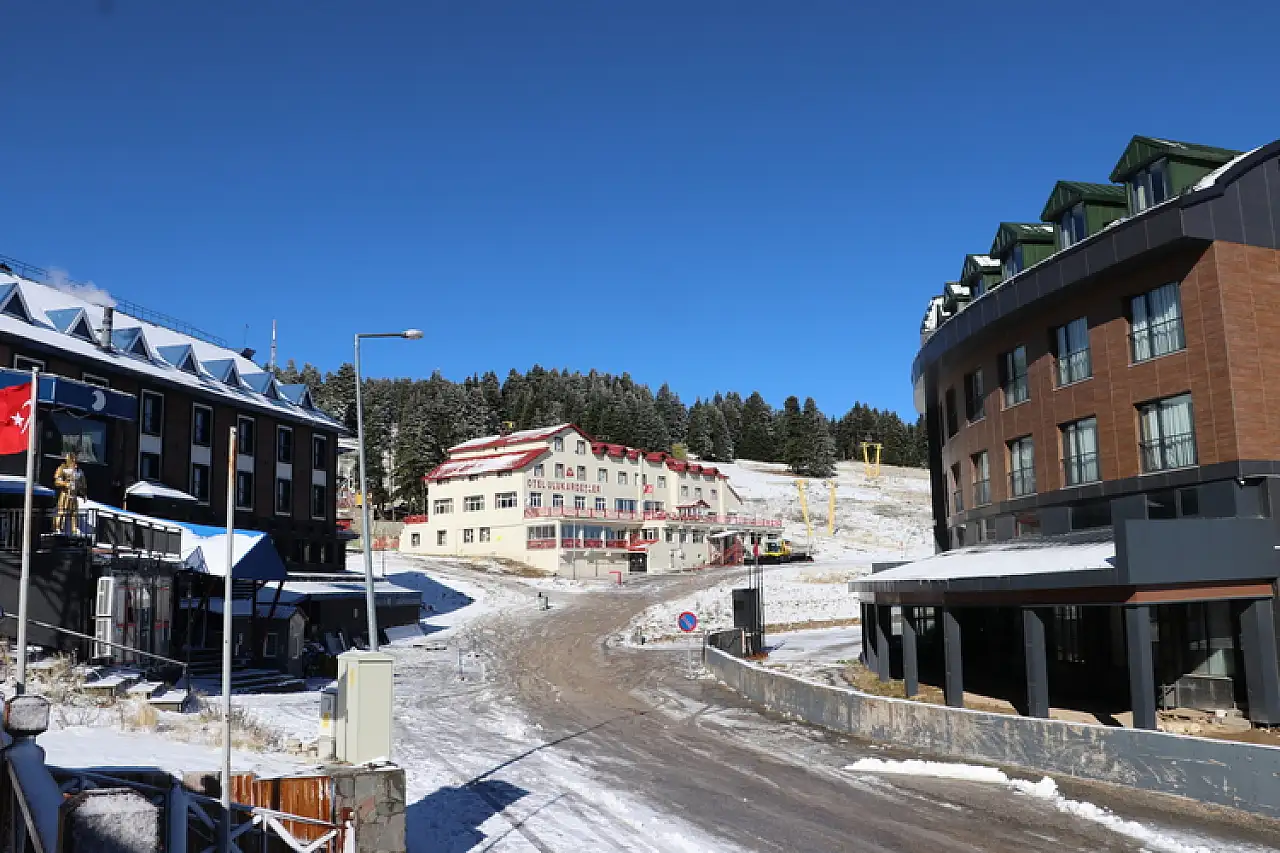 Uludağ'da gece saatlerinde başlayan kar, çok sayıda işletmenin yer aldığı Oteller Bölgesi'ni beyaza bürüdü.