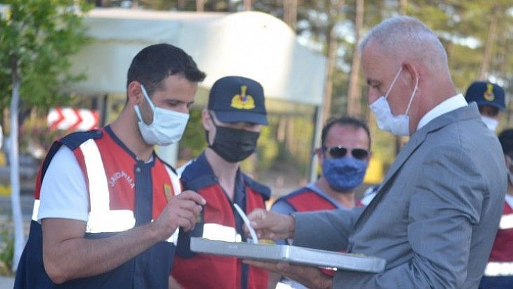 Marmaris-Muğla Karayolu'nun 21'inci kilometresinde bulunan kontrol noktasını ziyaret eden Marmaris Kaymakamı Ertuğ Şevket Aksoy, jandarma ekiplerini denetleyerek baklava ikram etti.