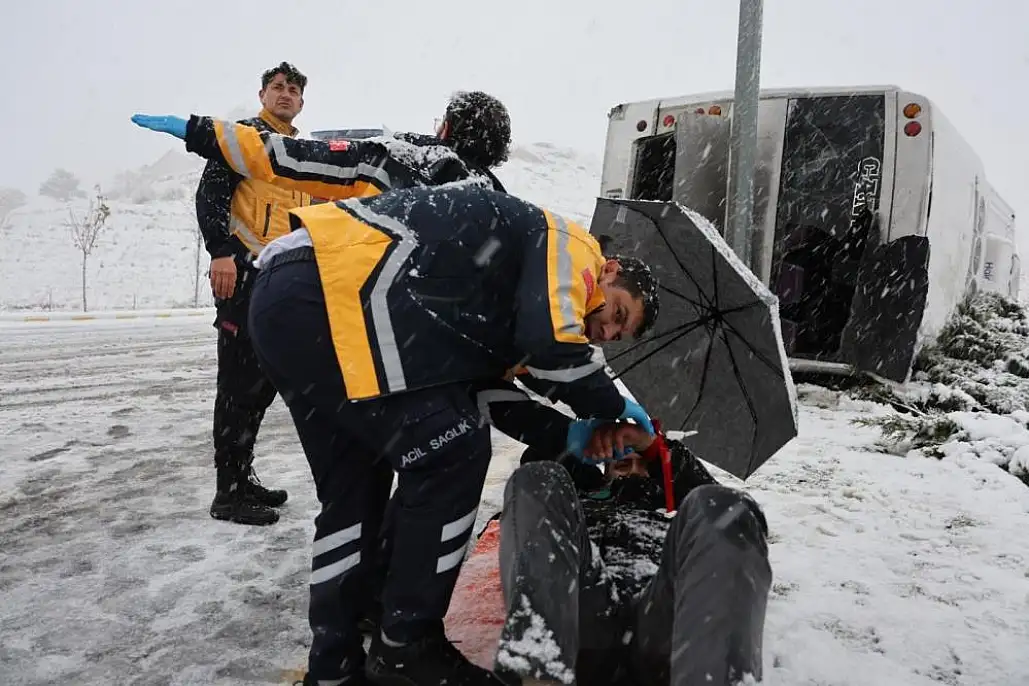 Nevşehir'de işçileri taşıyan servisin takla atması sonucu 14 kişi yaralanırken, yaralılardan biri sağlık ekiplerinin gelmesini şemsiye ile uzanarak bekledi.