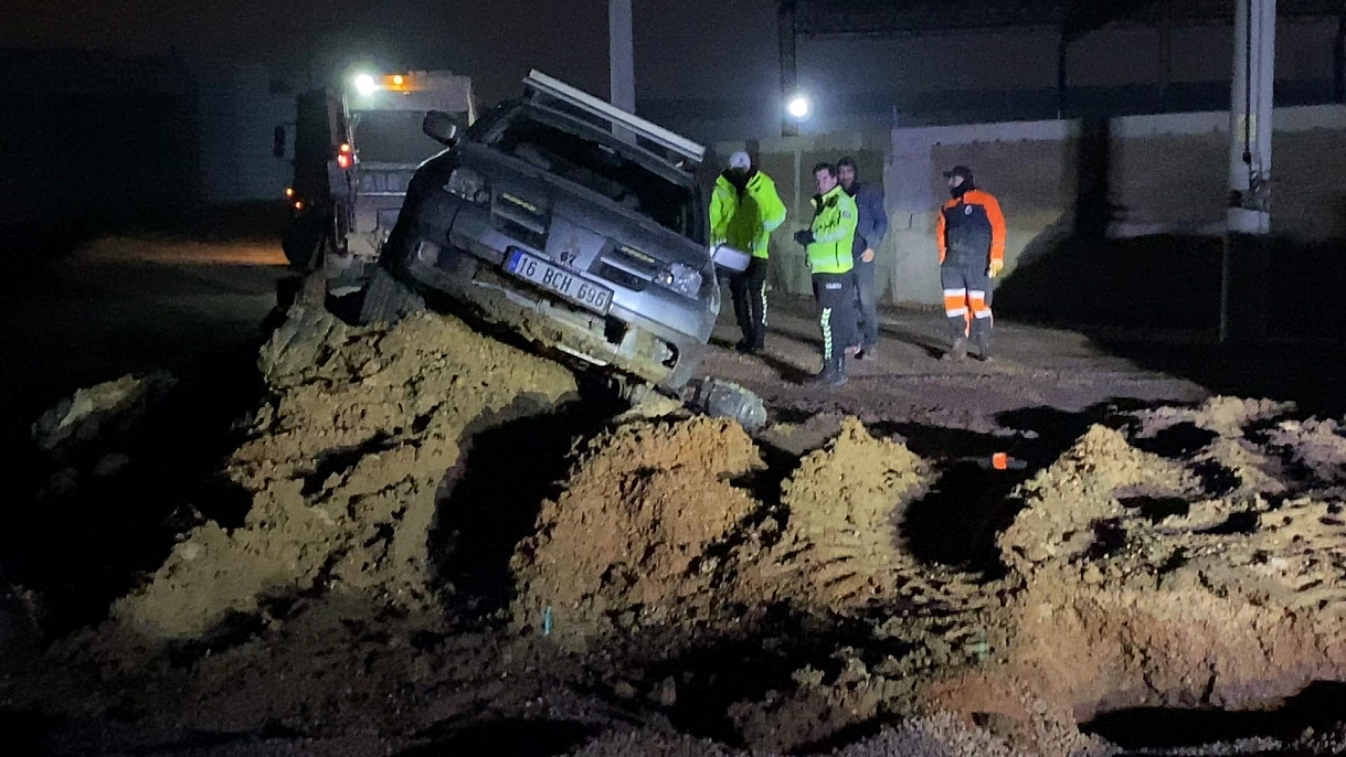 Kazada alkollü sürücü, aracıyla altyapı çalışmasına saplandı. Kaza yapan sürücü, telefon kamerasıyla kazayı bir spiker gibi anlattı. O anlar kameraya yansıdı.