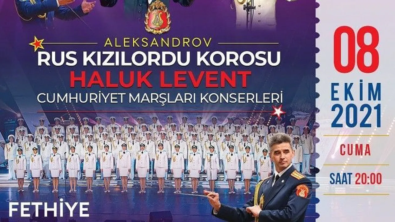 Türkiye’de birçok bölgede turneye çıkan Rus Kızılordu Korosu, Fethiye Belediyesi’nin işbirliği ile Fethiye’de de sahne alacak. Ünlü sanatçı Haluk Levent ile birlikte Kızılordu Korosu, 8 Ekim 2021 Cuma Günü saat: 20.00’de Beşkaza Meydanı’nda sahne alacaklar. Covid-19 tedbirleri kapsamında program girişinde aşı kartı veya en fazla 48 saat öncesinde yapılmış PCR testi sonucu bulundurulması zorunluluğu getirildi. Cumhuriyet Marşları konserine ilginin yoğun olması bekleniyor.