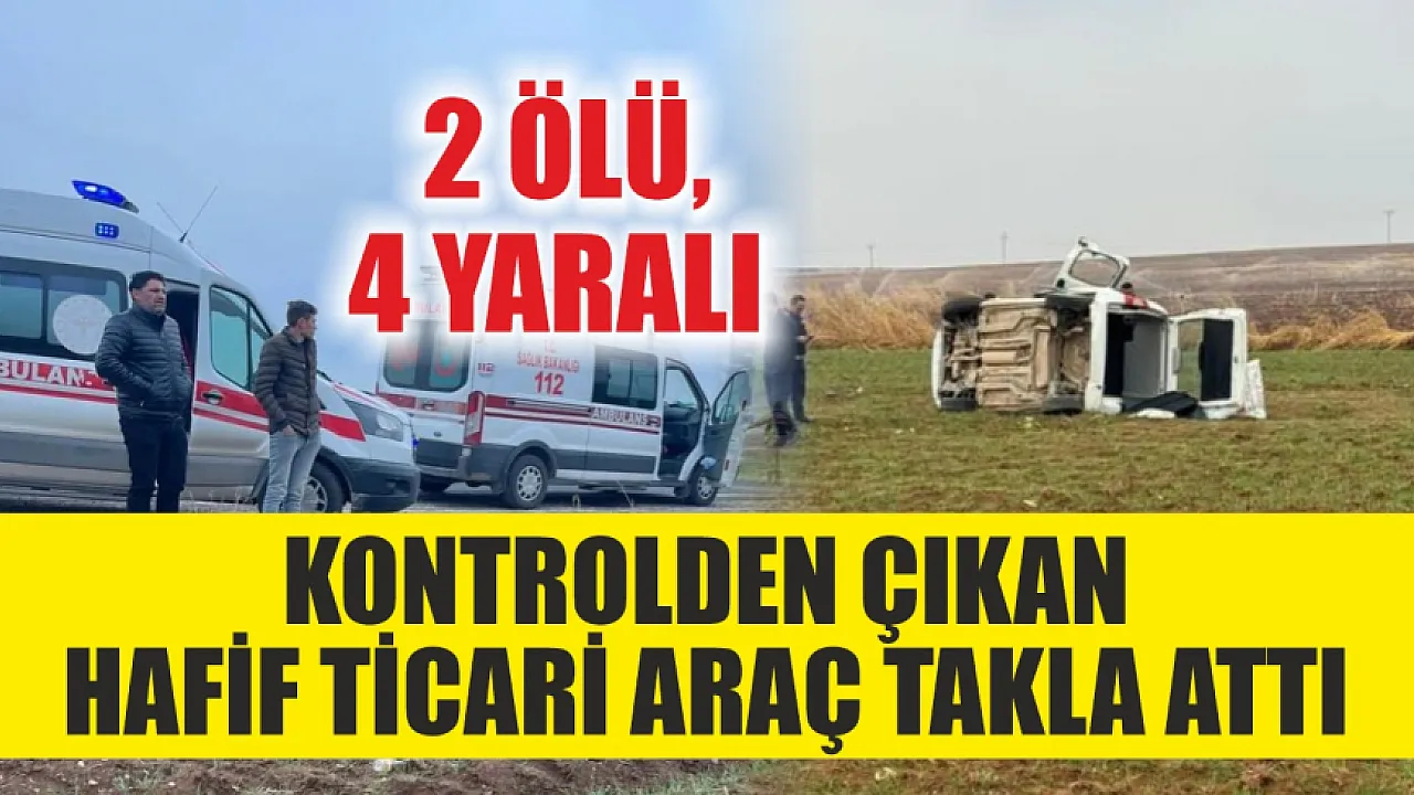 Mardin'in Kızıltepe ilçesinde kontrolden çıkarak devrilen hafif ticari araçtaki 2 kişi öldü, 4 kişi yaralandı. Edinilen bilgiye göre, Dikmen Mahallesi Ceylanpınar yolu üzerinde sürücüsünün ismi belirlenemeyen 31 KDP 15 plakalı hafif ticari araç, kontrolden çıkarak devrildi.