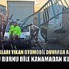 • Korkulukları yıkan otomobil duvarda asılı kaldı, sürücü burnu bile kanamadan kurtuldu