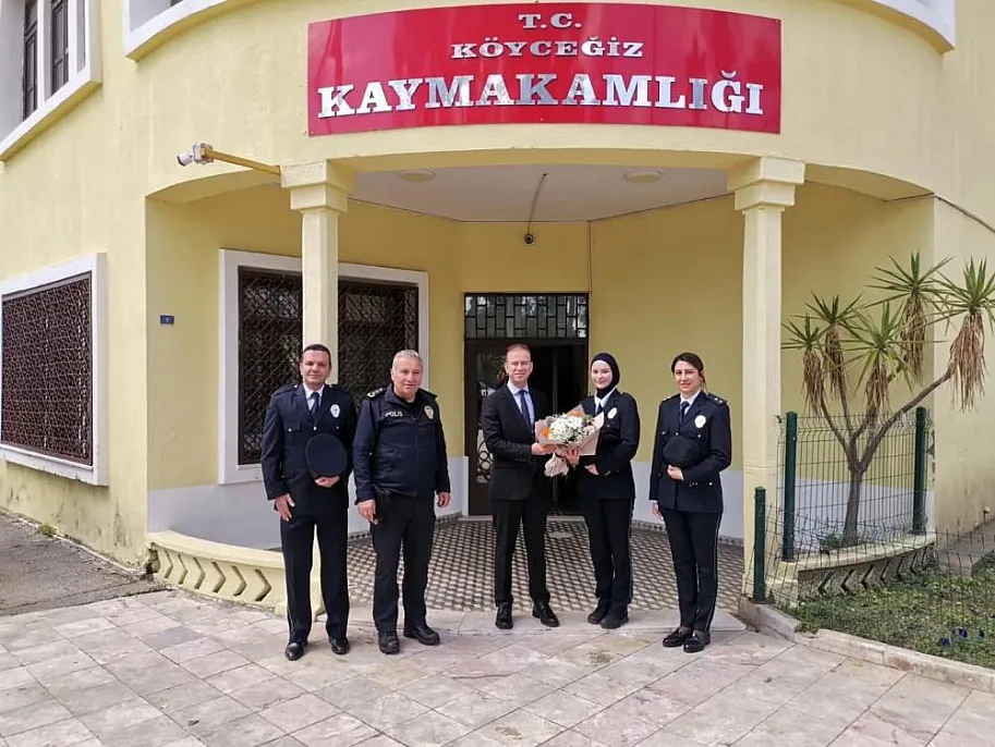 Muğla'nın Köyceğiz ilçesinde Emniyet Müdürlüğü Kaymakam Mustafa Maslak'a 10 Nisan Polis Haftası nedeniyle ziyaret gerçekleştirdi. Türk Polis Teşkilatı'nın 180. kuruluş yıl dönümü ve 10 Nisan Polis Haftası kapsamında İlçe Emniyet Müdürü Hüseyin Başkan ve Emniyet Müdürlüğü personelleri Köyceğiz Kaymakamı Mustafa Maslak'ı makamında ziyaret etti.