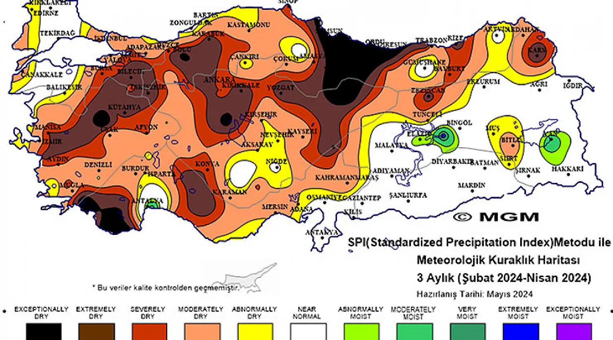 2024 Yılı Nisan Ayı Alansal Yağış Raporu’na göre; Türkiye geneli nisan ayı yağışı normalinin ve geçen yıl nisan ayı yağışının altında gerçekleşti. 2024 yılı Nisan ayı yağışı 28.5 mm, nisan ayı normali (1991-2020) 57.5 mm, 2023 yılı Nisan ayı yağışı 86.8 mm’dir. Yağışlar normaline göre yüzde 50 ve geçen yıl nisan ayı yağışlarına göre yüzde 67 azaldı. Nisan yağışları Bilecik, Bursa, Kastamonu, Samsun, Amasya, Tokat, Giresun, Rize, Trabzon Rize, Artvin, Ardahan, Burdur, Afyonkarahisar, Denizli ve Antalya sahil kesiminde yer yer yüzde 80’in üzerinde azalma gösterirken, İstanbul Avrupa yakası, Kırklareli, Çanakkale ve Mersin Mut çevrelerinde yüzde 60’ı aşan artışlar kaydedildi. Bölge genelinde tüm bölgeler normalinin altında yağış almış, en fazla azalma gösteren bölge yüzde 70 ile Karadeniz Bölgesi oldu. Bölgenin 2024 yılı nisan ayı yağışları son 64 yılın en düşük seviyesinde gerçekleşti.