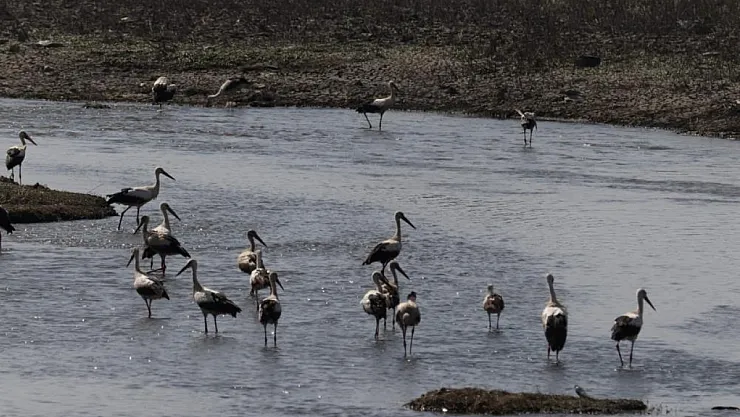 Leylek sürüleri aşırı sıcaklar nedeniyle su kenarlarına indi.