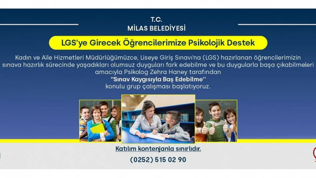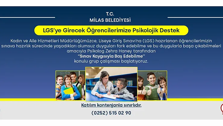 Milas Belediyesi, Liselere Geçiş Sınavı'na girecek olan 8. Sınıf öğrencileri için 'Sınav Kaygısıyla Baş Edebilme' konulu destek eğitimi gerçekleştirecek.