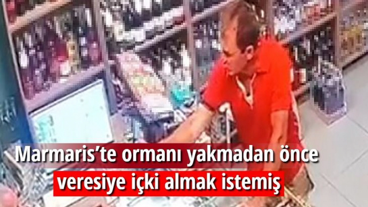 Muğla'nın Marmaris ilçesi Bördübet Yediadalar mevkiinde ormanı ateşe veren S.A.'nın ormanlık alana gitmeden önce bir marketten veresiye içki almaya çalıştığı anlar, güvenlik kamerası görüntülerine yansıdı.