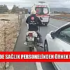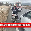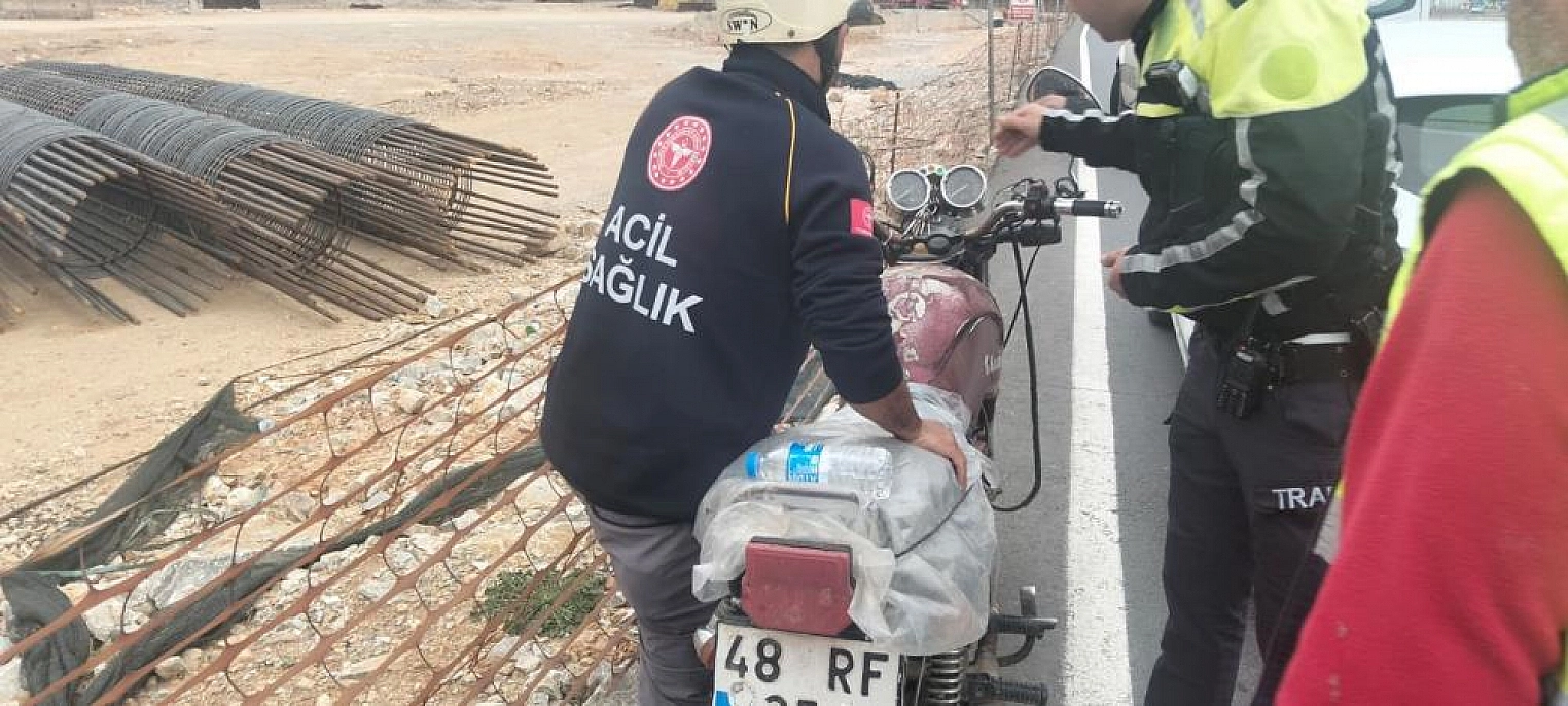 Muğla'nın Menteşe ilçesinde meydana gelen trafik kazasında hafif yaralanan bir vatandaşa sağlık ekibi müdahale ederken, bir başka sağlık personeli de motosikletini hastaneye ulaştırdı.