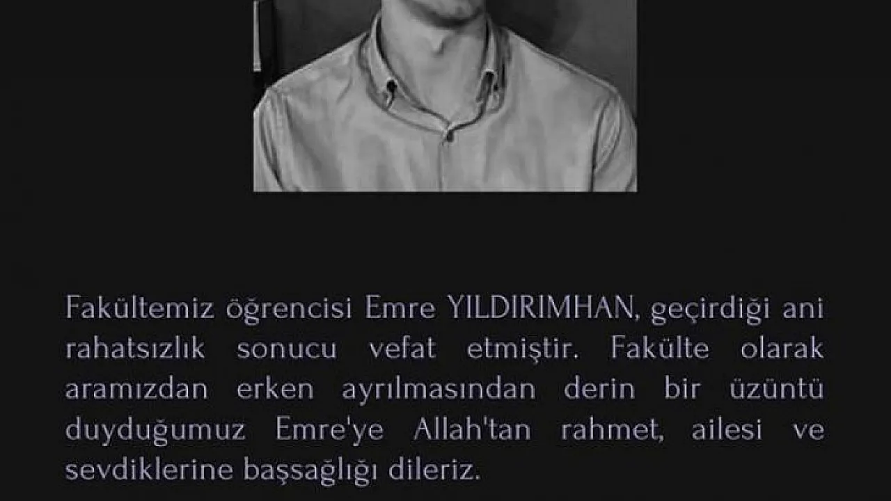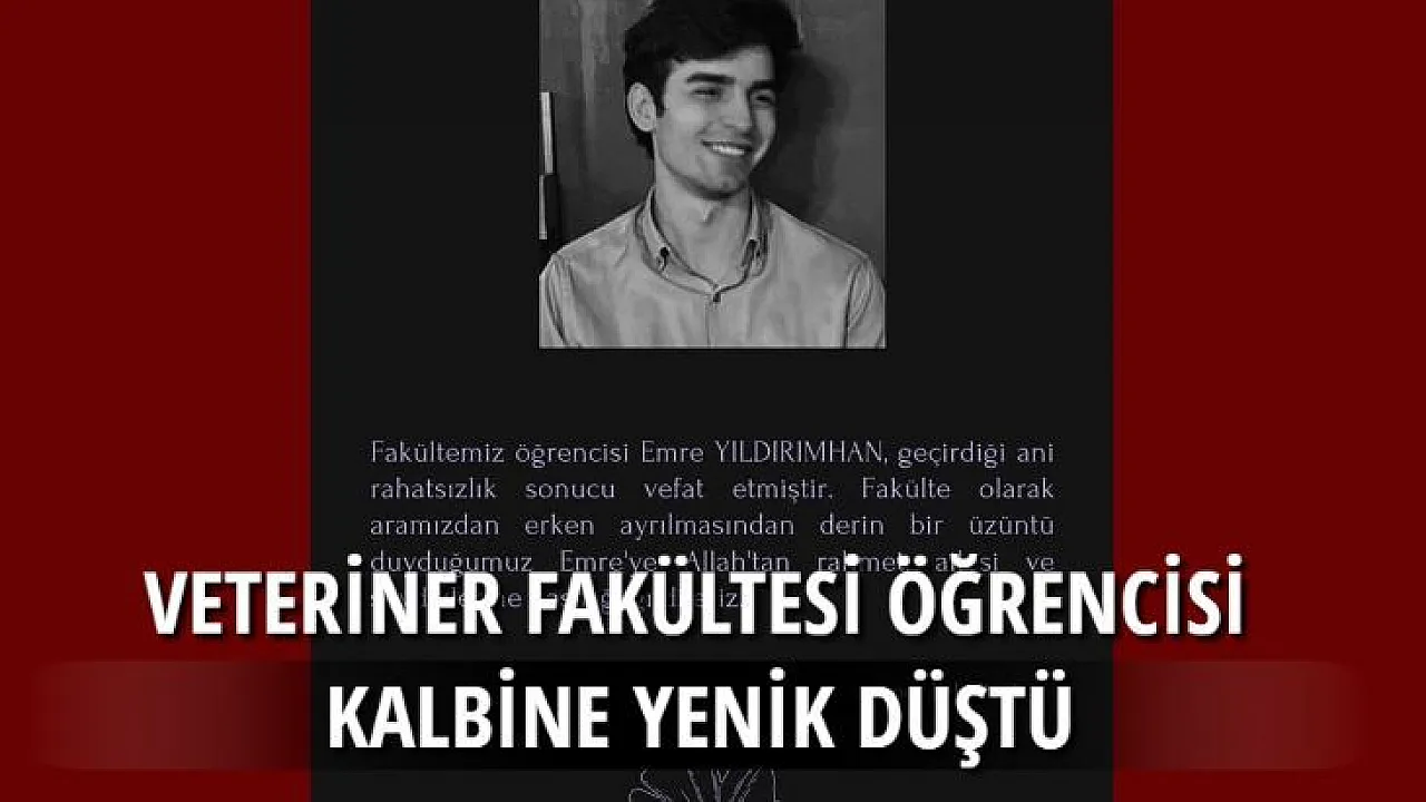 Muğla Sıtkı Koçman Üniversitesi Milas Veteriner Fakültesi son sınıf öğrencisi 22 yaşındaki Emre Yıldırımhan seminer için hocaları ve okul arkadaşlarıyla birlikte gittiği İstanbul’da geçirdiği kalp krizi sonrası kaldırıldığı hastanede hayatını kaybetti. Emre Yıldırımhan’ın cenazesi memleketi Sakarya’nın Akyazı ilçesinde toprağa verildi. Hayatını kaybeden genç Emre’nin okul arkadaşları da cenazede gözyaşı döktü.
