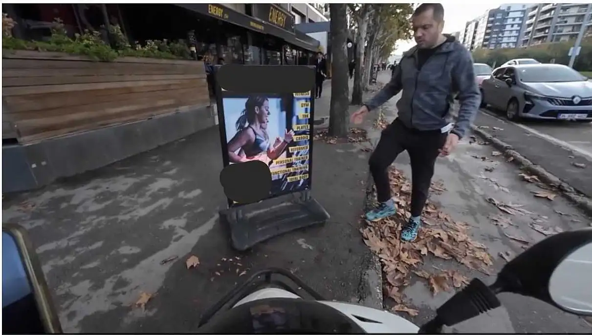 Başka bir araç sürücüsüne sözlü olarak tepki gösteren motosikletli, gaza ani şekilde yüklenince kaygan zeminde kontrolü kaybedip kaldırım üzerindeki reklam dubasına çarptı. Olay sırasında çevrede bulunan bir vatandaşın yaptığı esprili uyarı dikkat çekti.