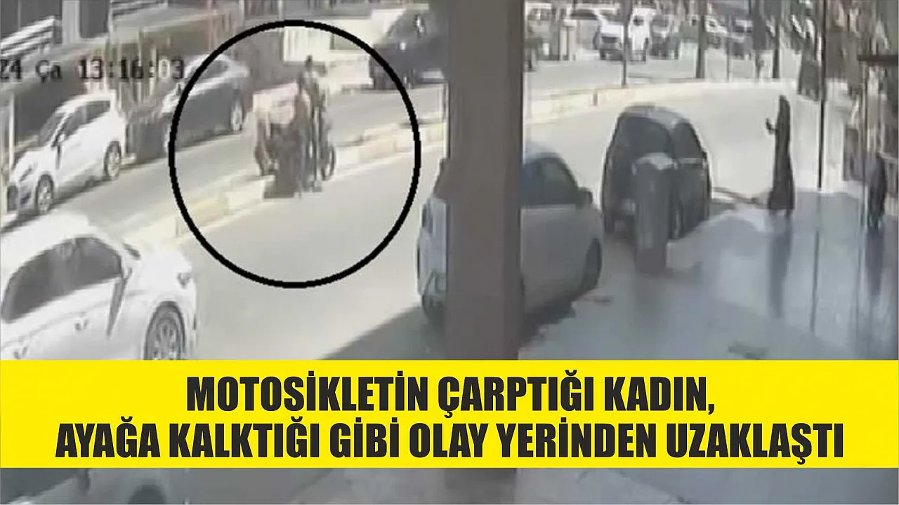 Yaşanan kazada motosikletin çarptığı kadın, ayağa kalktığı gibi olay yerinden uzaklaşırken o anlar güvenlik kamerasına yansıdı.