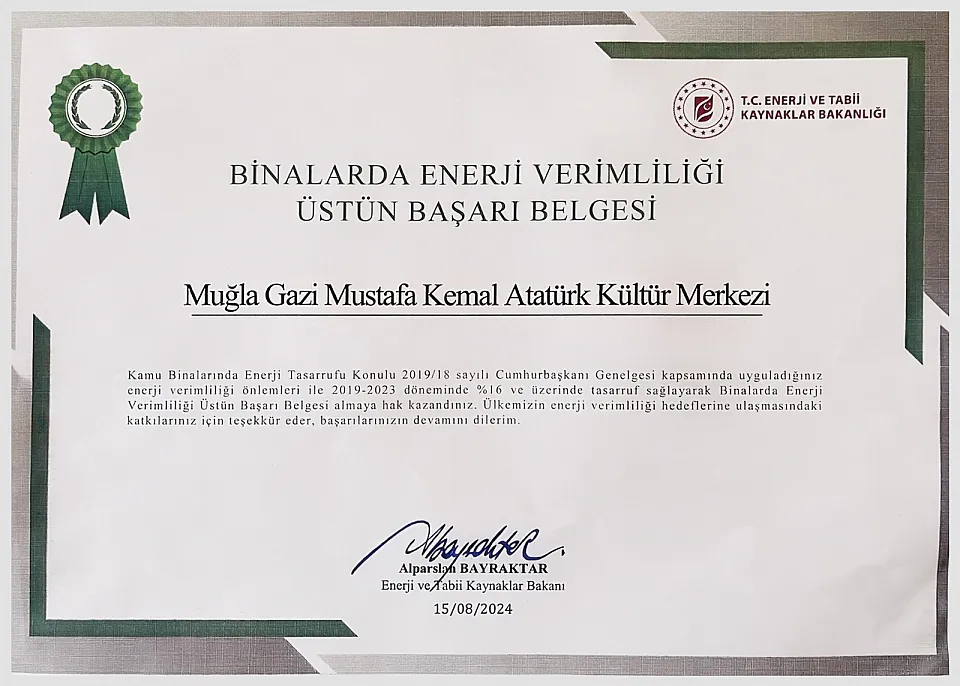 Muğla Büyükşehir Belediyesi Gazi Mustafa Kemal Atatürk Kültür Merkezi ortalama yüzde 43 tasarruf sağlayarak, Enerji ve Tabii Kaynaklar Bakanlığı'ndan 'Binalarda Enerji Verimliliği Üstün Başarı Belgesi' aldı.