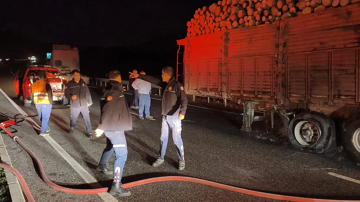 Muğla çevre yolunda tomruk yüklü tırda yangın çıktı