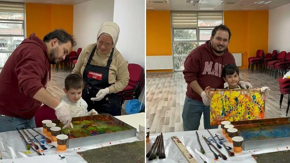 Muğla'da aileler ve çocuklar ebru sanatıyla renklerin yolculuğuna çıktı