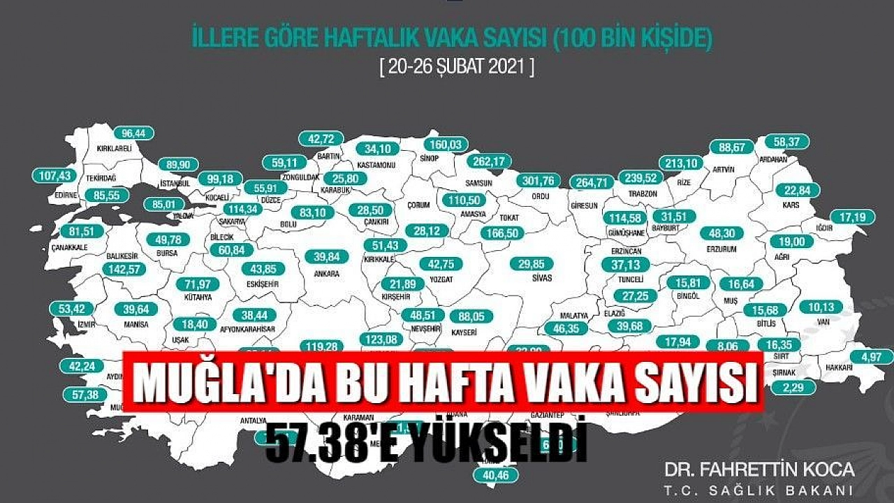 Sağlık Bakanlığı, illere göre haftalık vaka sayılarını açıkladı. Muğla'da bu hafta vaka sayısı 57,38'e çıktı.