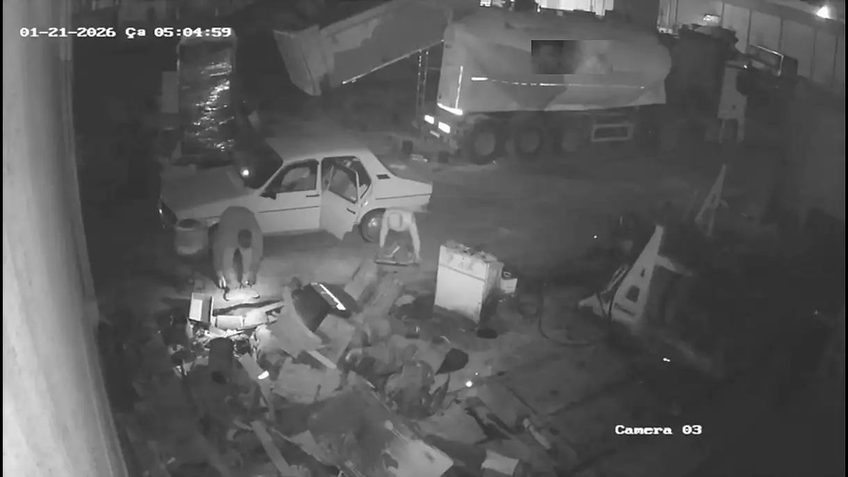 Muğla'da oto sanayi sitesinde bir iş yerinde, iki kişinin hurdaları çalarak kayıplara karıştığı anlar güvenlik kamerasına yansıdı.