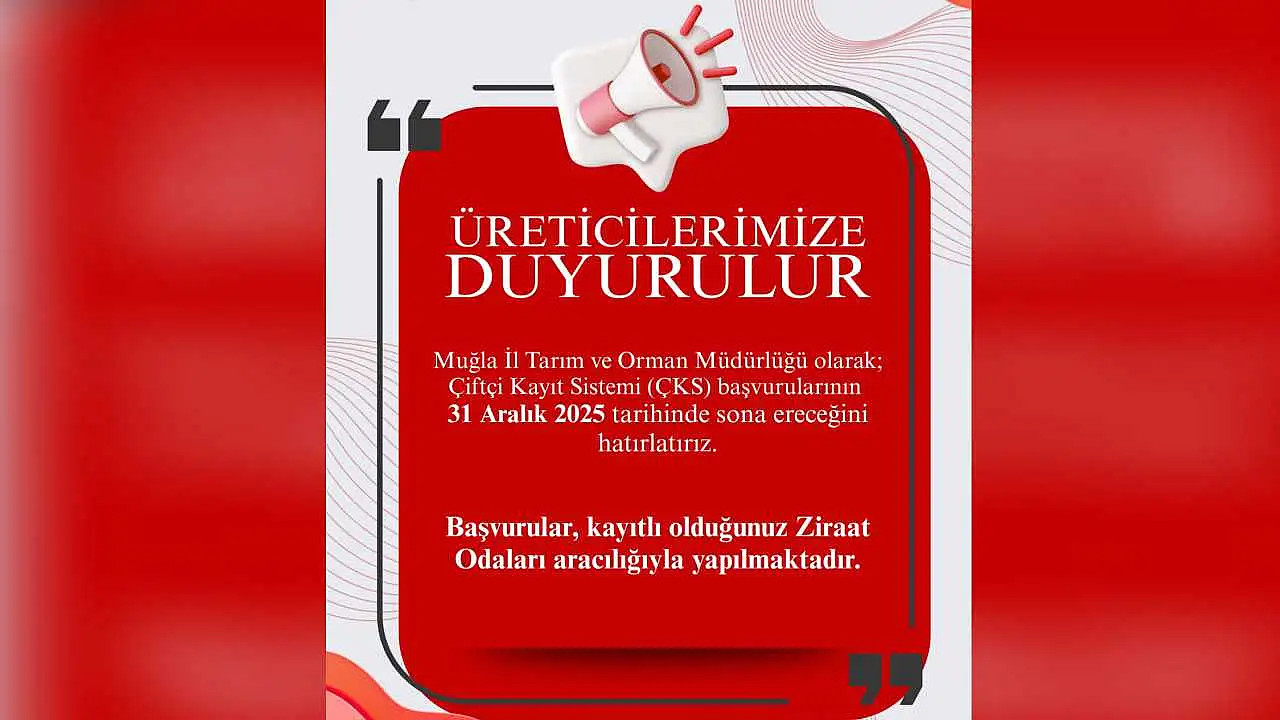 Muğla İl Tarım ve Orman Müdürlüğü, il genelinde tarımsal faaliyetlerini sürdüren üreticilere yönelik önemli bir duyuru yaptı. Yapılan açıklamada, Çiftçi Kayıt Sistemi (ÇKS) başvurularının 31 Aralık 2025 tarihinde sona ereceği hatırlatıldı.