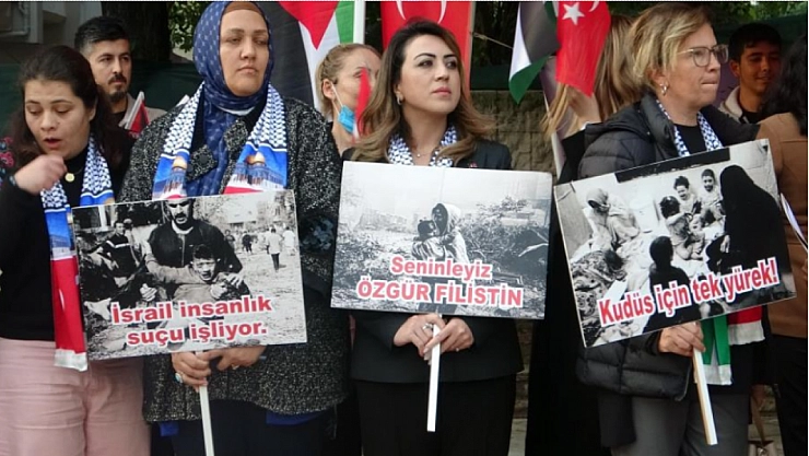 Muğla'da Sivil Topum Kuruluşları Filistin'e destek amacıyla Menteşe ilçesi Sınırsızlık Meydanında oturma eylemi yaptı.