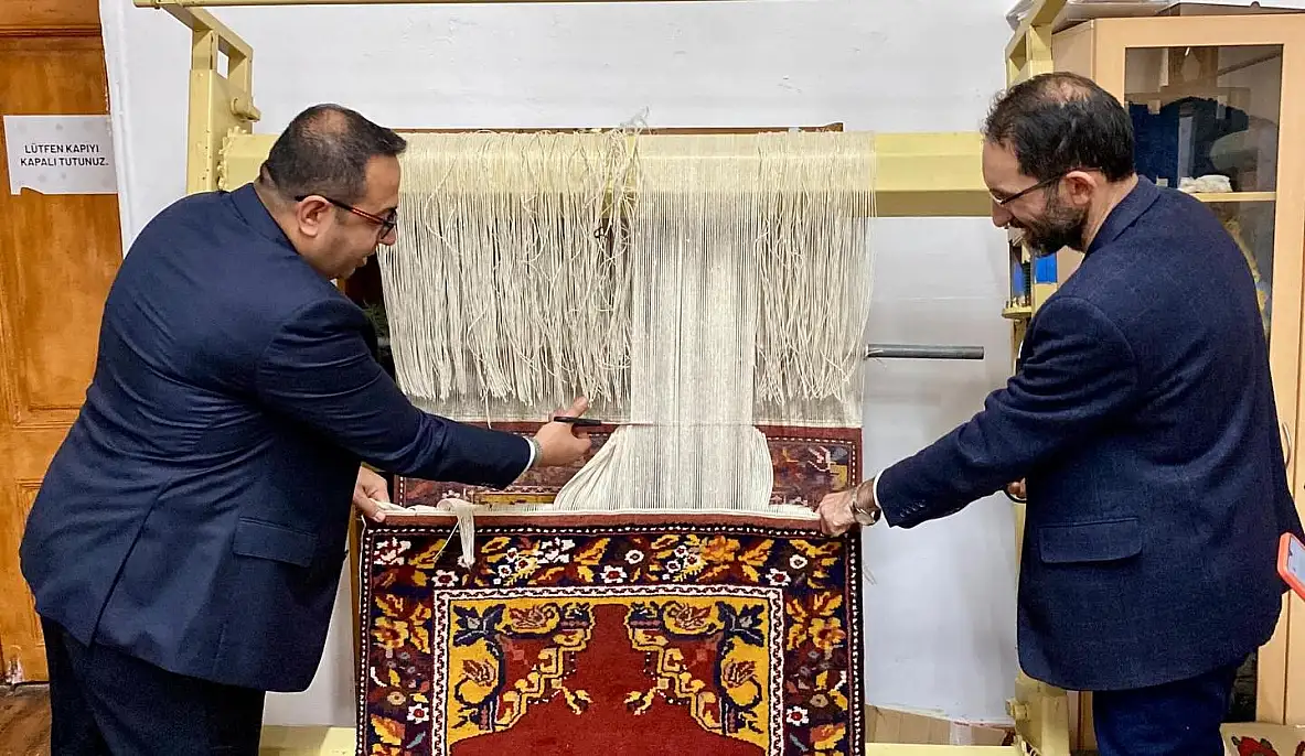 Muğla İlçe Millî Eğitim Müdürü Mehmet Keleş, Muğla Olgunlaşma Enstitüsü'nü ziyaret ederek, el emeği göz nuru ile tamamlanan geleneksel halının kesim törenine katıldı.