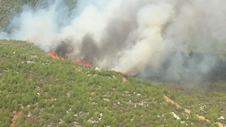 Milas ilçesine bağlı Akgedik Barajı Cehennem Deresi mevkisindeki ormanlık alanda başlayan ve şiddetli rüzgar nedeniyle tarım arazilerine de sıçrayan yangın henüz kontrol altına alınamadı. Geniş bir alanda devam eden yangına 9 helikopter, 27 arazöz, 12 su tankeri, 3 dozer ve 160 yangın söndürme işçisiyle müdahale ediliyor. Muğla Orman Bölge Müdürlüğü ekipleri Milas’taki yangına havadan ve karadan yoğun bir şekilde müdahale ederken, Bodrum Mumcular’da da yangın çıktığı bilgisi geldi. Gökpınar ve Bayır mahalleleri arasında kalan ormanlık alanda çıkan yangına müdahale için Milas’taki ekiplerden kaydırma yapıldı. Geçtiğimiz hafta da büyük bir yangının yaşandığı Mumcular’daki yangını kontrol altına almak için çalışmalar devam ediyor.