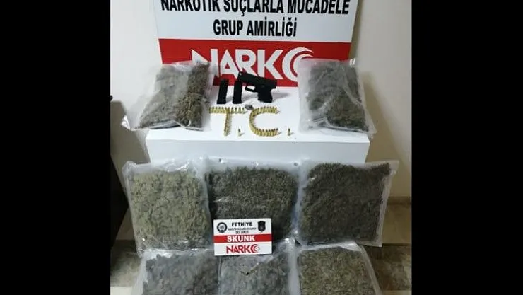 Edinilen bilgiye göre, Fethiye İlçesine dışından yüklü miktarda uyuşturucu madde getirileceği bilgisi üzerine harekete geçen Narkotik Suçlarla Mücadele Şube Müdürlüğü Fethiye Grup Amirliği ekipleri tarafından yapılan çalışmalar sonucunda, tespit edilen araçta ilçe girişinde yapılan aramada 1 adet ruhsatsız “Glock” marka tabanca ve tabancaya ait 2 adet şarjör ile 50 adet fişek ve toplamda net 3952 gram “Skunk” isimli uyuşturucu madde ele geçirildi.