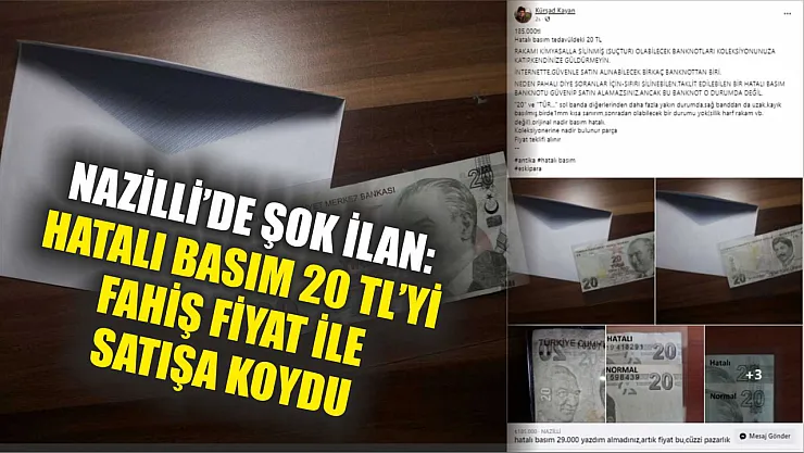 Nazilli'de yaşayan bir vatandaş, hatalı basım olan 20 Türk Lirası'nı fahiş fiyat ile sosyal medyadan satmak üzere ilan oluşturdu.
