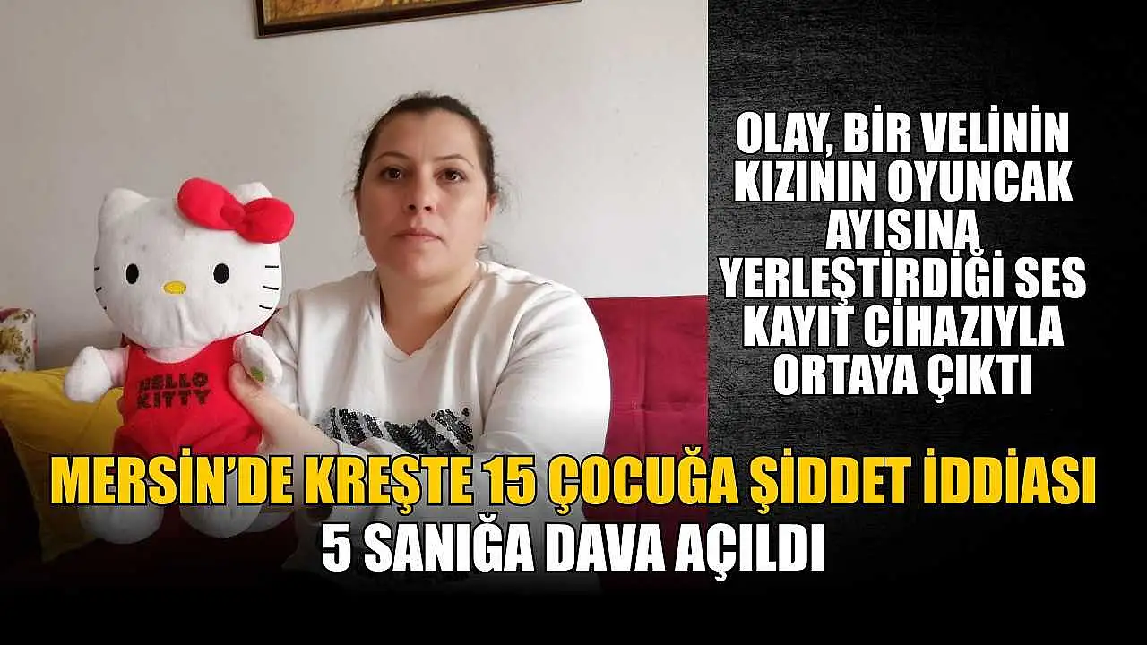 Mersin'de 4 yıl önce bir kreşte 15 çocuğa yönelik şiddet uygulandığı iddiasıyla başlatılan soruşturma tamamlandı. Olayın, bir velinin kızının oyuncak ayısına yerleştirdiği ses kayıt cihazıyla ortaya çıktığı öğrenildi. Tutuksuz yargılanan 5 sanık hakkında 'çocuğa karşı eziyet' suçundan dava açıldı.