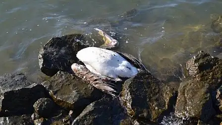 Fethiye'de sahil bandında kıyıya vuran ölü pelikan merak konusu oldu. Kıyıda balık tutanların farkında vardığı ölü pelikanın, akıntıyla sürüklenerek kıyıya vurduğu tahmin ediliyor.