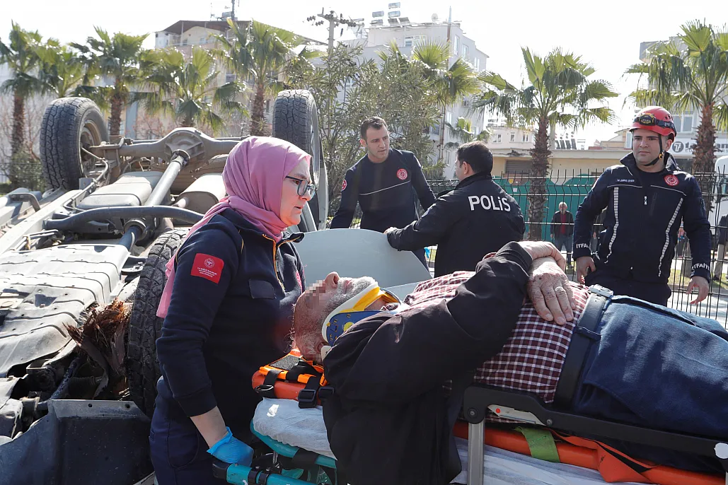 Direksiyon hakimiyetini kaybeden sürücü yol kenarındaki palmiyelere çarparak takla attı. Araçta sıkışan sürücüyü itfaiye ve sağlık ekipleri bulunduğu yerden çıkardı.