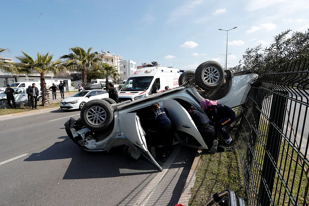 Direksiyon hakimiyetini kaybeden sürücü yol kenarındaki palmiyelere çarparak takla attı. Araçta sıkışan sürücüyü itfaiye ve sağlık ekipleri bulunduğu yerden çıkardı.